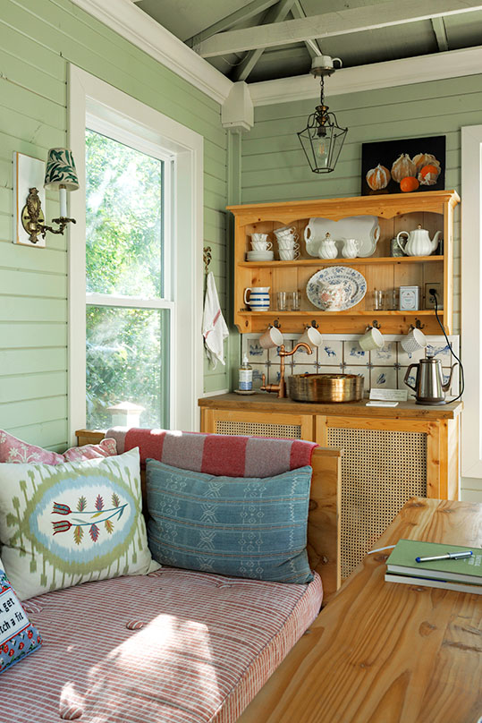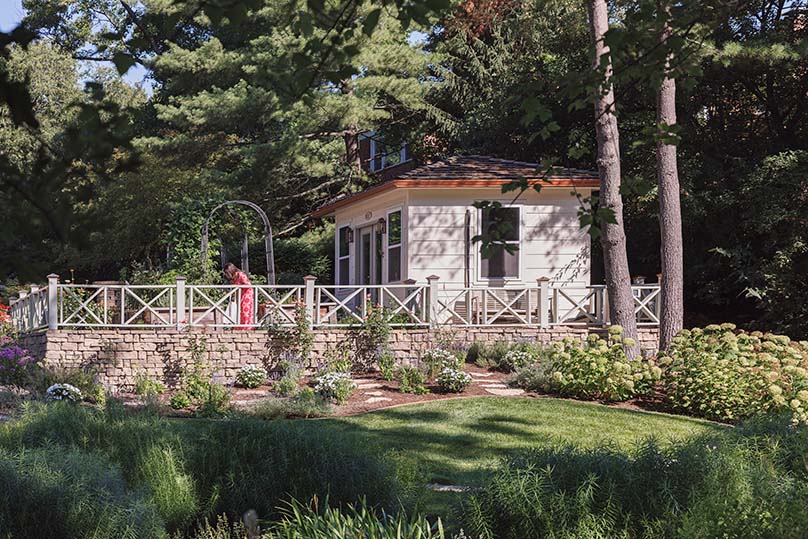 The charming garden “shed” with comfortable, pillow-filled furniture, lovely gardening books and tea making supplies was an outgrowth of the Covid epidemic. The couple’s daughter Minerva was a student at Washington University and allowed to shelter in place with 10 friends, who often made their way to the Pappu’s home. With 10 college-age girls almost continually around and finding herself constantly cooking, Natasha needed a place to be alone. She created what her husband calls “her sanctuary.” She still finds it an ideal place to read and reflect. Natasha uses Pinterest as a way to catalog her gardening and design ideas and have “everything on one page. In the old days, we would have cut pictures out of magazines and put them in a scrap book,” she says with a laugh.