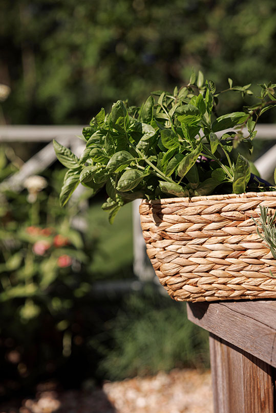 While the entire garden is lovely, the vegetable, herb and cutting garden just outside the house gets Natasha’s special attention. Surrounded by her favorite ‘Elizabeth’ pale pink English shrub rose, zinnias and cutting annuals, Natasha tends the fenced space herself. Most of the vegetables she starts from seed in the bay window of her dining room. Herbs include lemon verbena, basil, chives and oregano. She grows calendula or pot marigold “to keep the bugs away.” The strong scent is believed to deter mosquitoes, flies and other annoying insects.