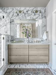 This primary suite was part of a large renovation for a young family of doctors with two children. They both sought a soft, sleek aesthetic, but her Brazilian background influenced some exciting choices. The white painted barn door with a large inset mirror reflects a window and striking floor-to-ceiling European white oak linen cabinets with can inserts and ample storage. The engineered stone countertop features a low backsplash with rounded side splashes that reference the shapes of the vanity’s inset drawer pulls, sink cut outs and vanity lights. Graphic porcelain tile is paired with authentic marble skirting, a stunning picket Carrara marble mosaic on the floor and marble chair rail around the mirrors. The warm white walls and taupe ceiling bring warmth and depth and accentuate the marble veining. The shower features a tiled trough drain, double shower head and rain shower head, with a hidden niche within the knee wall, giving this bathroom plenty of practicality as well.