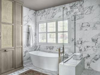 Every feature of this bath proves to be intentional and purposeful. The shape of the tub appears designed for comfort and ergonomics while every hook is thoughtfully placed. The color of the ceiling balances the weight of the cabinet while the small-scale floor tile creates a strong base texture without taking away the focus from the marble walls.