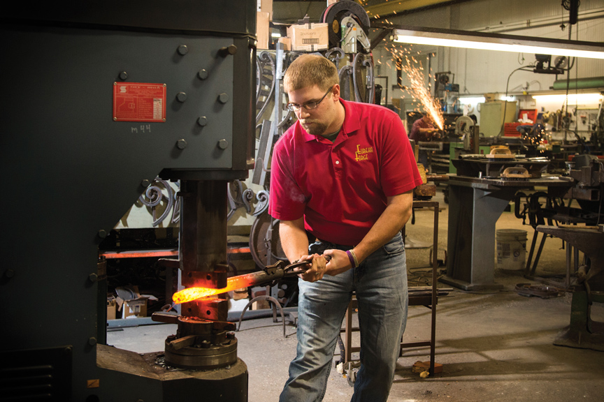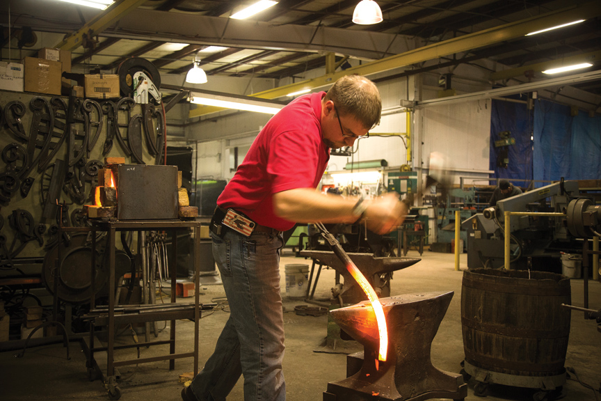 Fabricating the pieces is a collaboration among everyone at the shop. Each person specializes in one or more areas of the process. The shop is arranged in a rotation, starting with a raw materials area, then moving to a cutting area, forging, assembly and finishing areas. “We try to fuse old world techniques with modern technology to be more affordable,” says Mike. “Today, we use computer-aided drafting software to design a piece. We have a programmable cutting machine that can take the raw materials and cut all the pieces to the right size. We utilize power hammers to expedite the forging process,” he explains. They also use modern welding technology, in addition to the old “heat and hammer” method blacksmiths used in the 19th century and before.