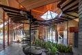 Properly nestled under the wings, the interior spaces splay in a cross shape from a central garden atrium. Its amenities include a primary bedroom and bathroom, a large living space appropriately named the “Greatest Room,” a study, garage and additional detached guest house.