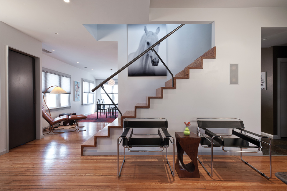 The stair addition is a well-designed transformation of the space. The space has an effective handling of natural and fixture lighting. The consistent and even-handed selection of materials and furnishings creates a modern open floor plan. The non-code railing is very cool!