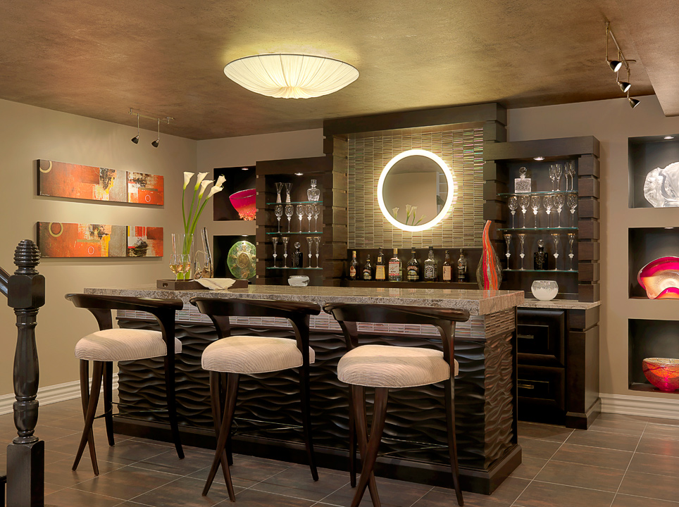 Transforming an unfinished room in their basement into a bar area, Direction in Design, Inc. created a space that is an extension of their client’s lower level family room. The back of the bar is placed between two closet doors, which were removed and replaced with lighted drywall niches displaying six vibrant hand blown glass pieces. Between the niches, the back bar is tiled in a horizontal glass tile in tones of taupe, beige and brown. A lighted mirror over the tile illuminates the bar.