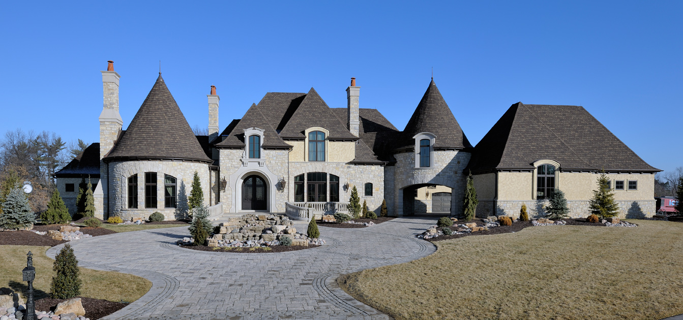 Rustic, mountain-themed landscaping and cobblestone laid pavers leading you from the street to the entry of the home add to the drama and grandeur of the exterior elevation of this home built by Bozich Construction. The exterior is done in true stucco with hand glazing.