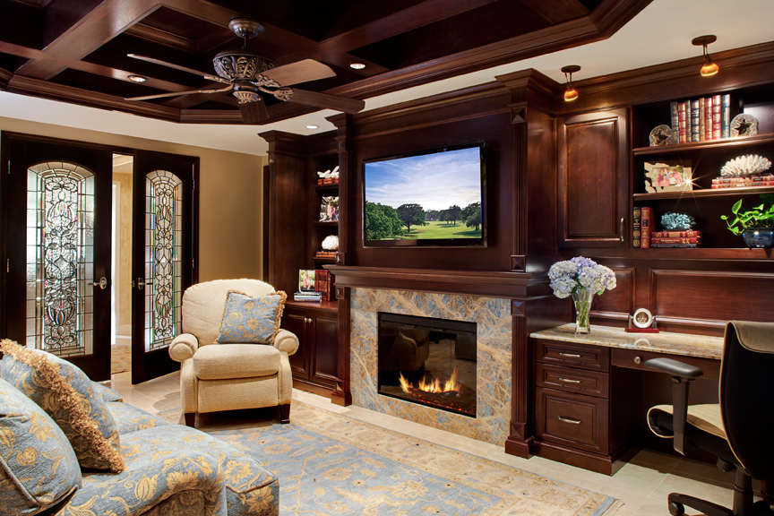 Two custom desks were created for each homeowner to accommodate their storage, filing and computer wiring needs. The shelves have a moulded detail on the front edge that frames glass inserts so light can shine through the unit. Special granite, “Blue Jeans,” was found in Florida and surrounds the fireplace. The flat screen TV was built into the upper structure with crown moulding and fluted pilasters.