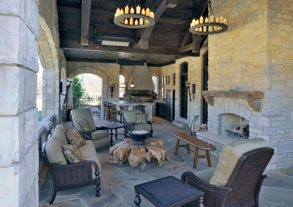 Elements such as full stonewalls, railings and flagstone paving give this outdoor living space, created by Bozich Construction, a natural feeling with all the comforts of home. Rustic timber beams that carry out from the home’s interior hearth room create a framed roof look while protecting the space from the outdoor elements. The ceiling is hand scraped and hewn with tongue-and-grooved construction.