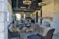 A cozy seating area is positioned around the stone fireplace making this spot functional for all seasons. The rustic mantel is constructed from reclaimed wood. The flagstone paving carries from the covered living area to the pool area.