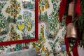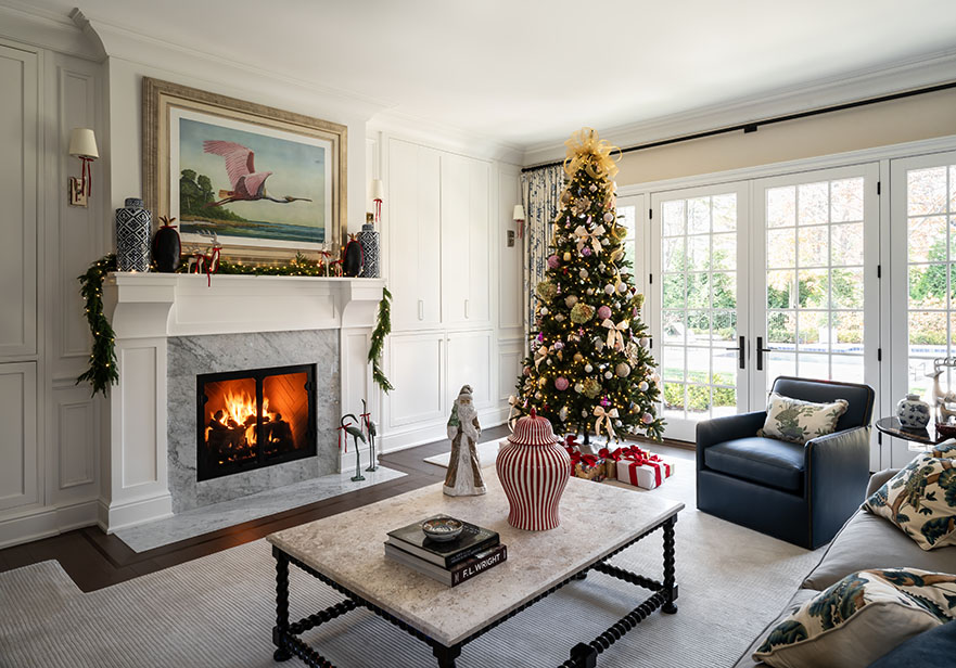 In the living room, a beloved painting of a roseate spoonbill served as inspiration for the room’s colorways. “I ended up with a lot of birds around the house, so I joked maybe we could do a bird tree in the living room,” says the wife. “This is where C&M’s talent comes in to design a tree that’s still refined based on the colors in the room and the bird art.” Maria says they utilized pinks, blues and golds for the tree, and added natural elements as well. “The owners have hydrangea bushes in the yard, so we asked her to clip some of those in the fall and store them in her basement to dry,” says Maria. “And we incorporated those dried blooms in the tree as a way to pull the outside in, which created a really gorgeous ambiance.”