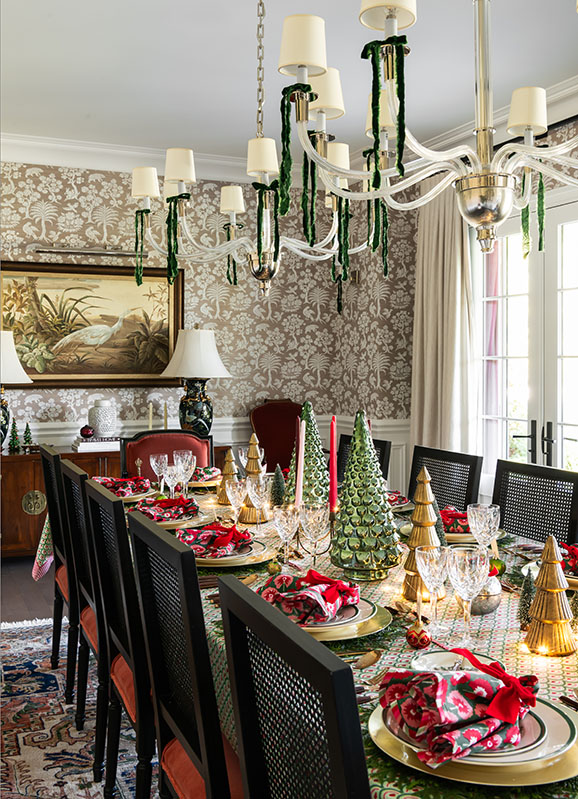 The C&M Interiors team drew upon coastal, Southern and natural influences with shining glimmers of holiday spirit to make each room dazzle for the tour. “We used a lot of what she already owned and added things here and there to pull rooms together,” says Channing. In the dining room, for example, which is already a favorite room of both client and designers, lead designer Jessica Kilian and the rest of the C&M team utilized the homeowner’s Spode Christmas Tree china, Waterford crystal and brass flatware the wife’s parents obtained during their time in Japan.