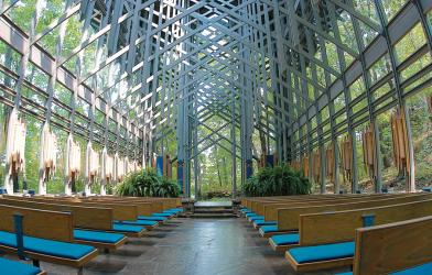 Nestled in a woodland setting, Thorncrown Chapel rises 48 feet into the Ozark sky. This magnificent wooden structure contains 425 windows and over 6,000 square feet of glass. It sits atop over 100 tons of native stone and colored flagstone. The chapel's simple design and majestic beauty combine to make it what critics have called "one of the finest religious spaces of modern times."