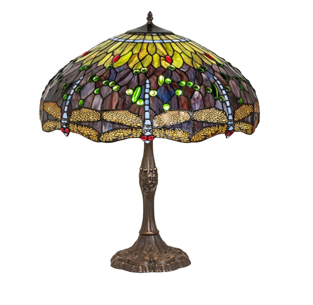 The Tiffany lamp was a popular lamp style often placed on desks and buffet tables. The intricate stained glass design was a luxurious and artistic statement in home design. Meyda Tiffany hanginghead dragonfly buffet table lamp, available at Ferguson Home.