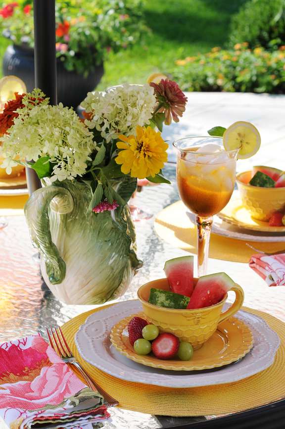 Both Diane and Ray love to cook and entertain. They recently enlarged the patio and added an outdoor fireplace. In nice weather Diane estimates they invite family and friends for dinner at least three times per week. In typical Diane fashion, the place settings, table linens and sometimes even the food itself carries the color theme forward. But, Diane emphasizes, the house, patio and all the furnishings are meant to be enjoyed. “Between us, Ray and I have 24 grandchildren, so this is a house that’s lived in,” she says.