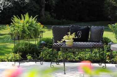 In her home it is almost hard to tell where the sunroom, designed in tones of gold and salmon, stops and the patio begins. Salmon patio umbrellas and seat cushions take the eye from indoors out. Planters spill over with salmon-colored geraniums and beds and pots feature lantana in shades that vary from gold to pink to orange. Black and white cushions in varying prints tie together the black wrought iron of the patio furniture, wire baskets and indoor/outdoor rattan chairs and sofas. “I like to dress up the patio like I would a living room,” she says.