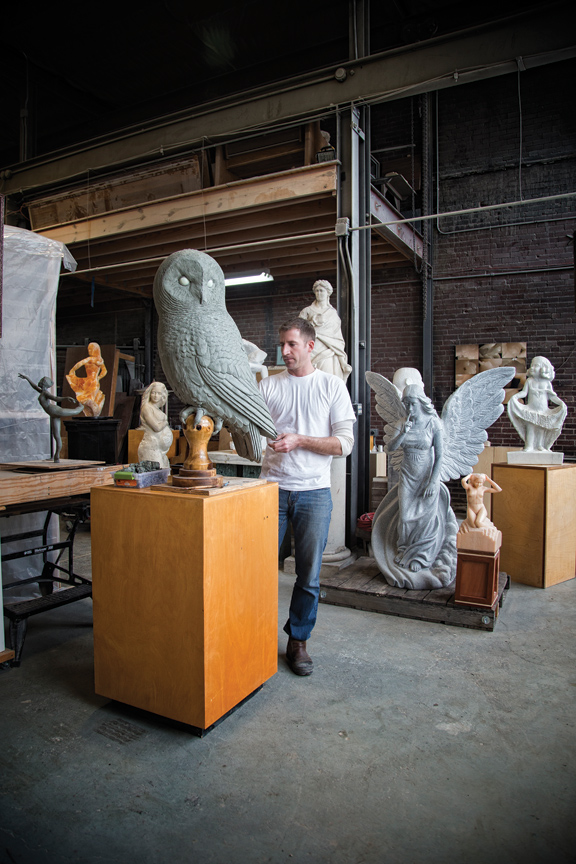 Mohler works in a converted monument shop. It includes a large back doorway for offloading materials, and a giant hoist system to be able to move heavy stones and finished works. Part of the studio includes space for a small gallery. “It's industrial enough that I don't worry about the dust and mess, yet is warm and inviting and easy to sweep up for shows.”