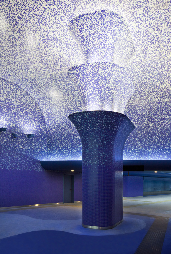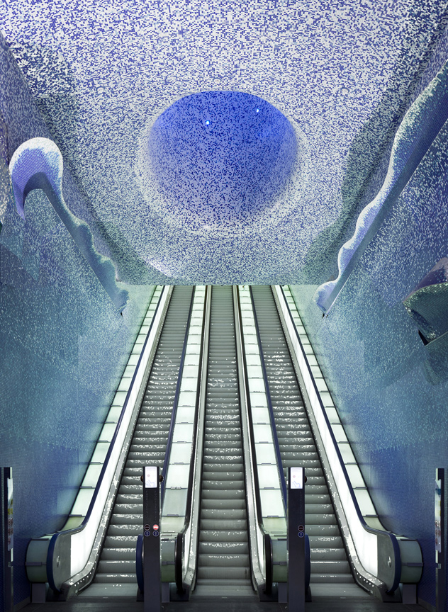 Located approximately 164 feet below the Via Toledo, one of Naples main shopping streets, the Toledo Metro Art station in Naples is one of the most stunning public transportation stations in the world. As part of a larger ongoing project to have architects, designers and artists contribute to station design, Spanish architect Oscar Tusquets Blanca designed the Toledo station with the theme of water and light. Part of the station extends below sea level inspiring the water theme. Varying blue vitreous mosaic tiles create the feeling of being under water. Softly illuminated by lighting, the sea’s waves move subtly as the traveler walks along the gallery. Robert Wilson, a U.S. artist, contributed his Light Panels to the project.