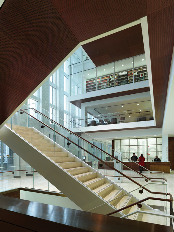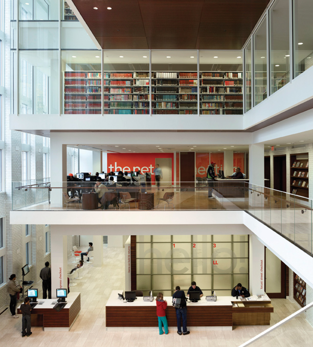 The North Wing truly ushers in the 21st century with the removal of old book stacks and the insertion of a newly constructed "building within the building." A three-story multistory public atrium creates an accessible and welcoming entry, with new public spaces that include a 250-seat theater and teen rooms. In total, the project has created more than 40,000 sf of new public space in the library. The building's Great Hall and four public wings are restored and revitalized to their turn-of-the-century splendor.