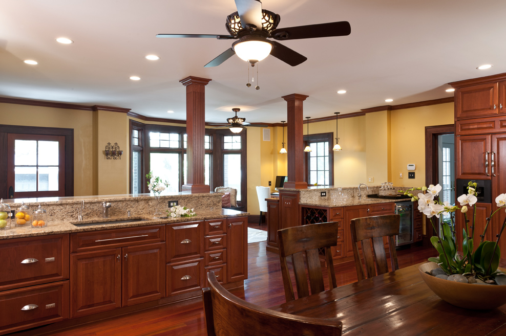 Contractor Mark Kohnen of Kohnen Craftsmanship brought the kitchen from its original 8-by-10 measurements to about 28-by-20 including the eat-in bar. What’s more, he flawlessly removed the back staircase, dropped the front one and added custom mahogany trim.