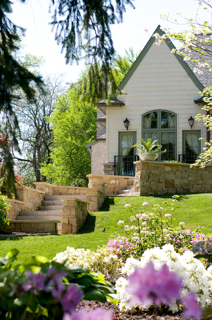 Solving those problems involved some very unglamorous grading work and the installation of an underground water storage tank now camouflaged by lovely white pines. Kelce & Pedley turned to Meyer Landscaping and Charles Stevenson for the earth moving and the truly heavy lifting on the project. Those efforts transformed necessary retaining walls into a series of beautiful terraces framed by stacked walls of creamy EW Gold limestone quarried in Ste. Genevieve, MO. Meyer Landscaping also amended and prepared the soil to provide the best possible medium for the trees and shrubs that were to come. All parties also worked to protect mature trees on the property during construction.