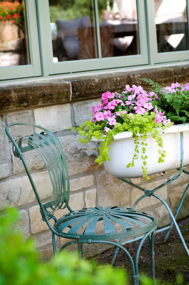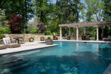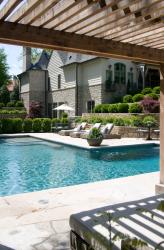 Whenever possible, the designers used old wood in place of new. Recycled timbers from a barn in Virginia top a wisteria-covered pergola off the kitchen. Also noteworthy in the pergola is a vintage-finished concrete table from Exceptional Outdoor Furnishings with a copper trough down the middle that can hold flowers or iced champagne. It is the Grossmans' dining spot of choice for a small dinner party.