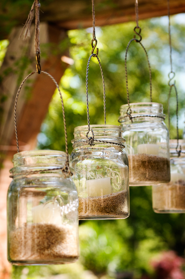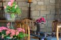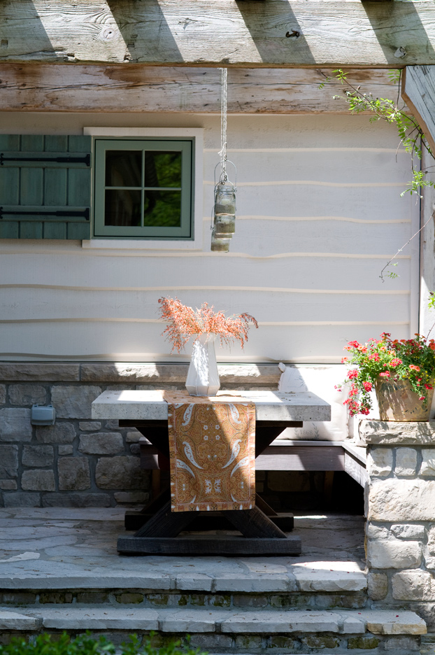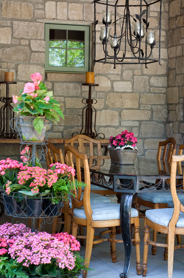 In addition to the small dining area off the kitchen, recycled wood from a tobacco barn in Kentucky frames a large entertainment space off the dining room and living room. A glass-topped dining table, comfortable outdoor couches and chairs and a huge stone fireplace provide plenty of space for guests. Flower-filled stone containers and a trough-like provincial fountain accent a large courtyard immediately adjacent to the covered area. “I wanted most of the flowers in pots that can be watered several times a week,” Jen notes. A hallmark of all the outdoor entertaining spaces is the amazing number of candle-filled chandeliers and lanterns that after dark come alive with softly flickering light.