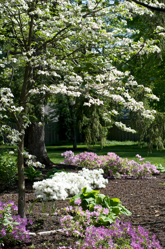 All areas off the back of the house encompass lovely views of the two-acre property, accented with mature trees and grass. A shady center island planted with dogwoods, azaleas, hydrangeas, hosta and edged in sunny spots with peonies, draws the eye through the grounds.