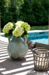 One of their biggest finds was a group of mature "green giant" arborvitae to screen the swimming pool on the east side of the house and provide privacy year around. They also made use of large numbers of boxwoods and hollies for rich green color 12 months a year. In keeping with country gardens in France and Italy, which make liberal use of gravel pathways, garden walks were constructed using decomposed granite, produced by Kafka Granite of Stratford, WI, a substance that packs well for a firm surface but still allows water to penetrate. Along with the evergreen shrubs, Kelce & Pedley added shrub roses and numerous hydrangeas to the terraces leading down to the pool. “The whole idea was to create an elegant but casual setting,” Nancy explains. “We also wanted to make sure the shrubs on the terraces didn’t get too big. We chose ‘little lime’ hydrangeas rather than the larger ‘limelight’ and smaller (flower) carpet roses rather than larger varieties."