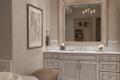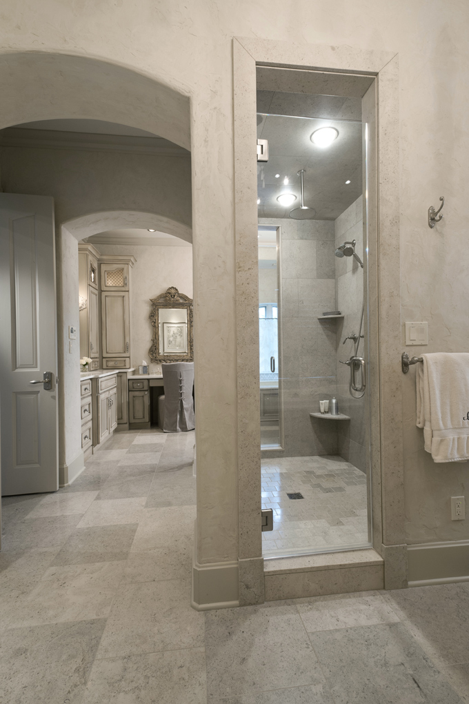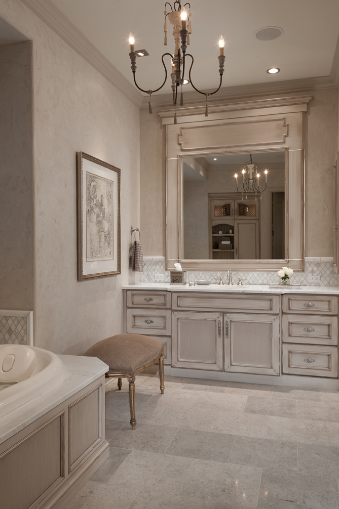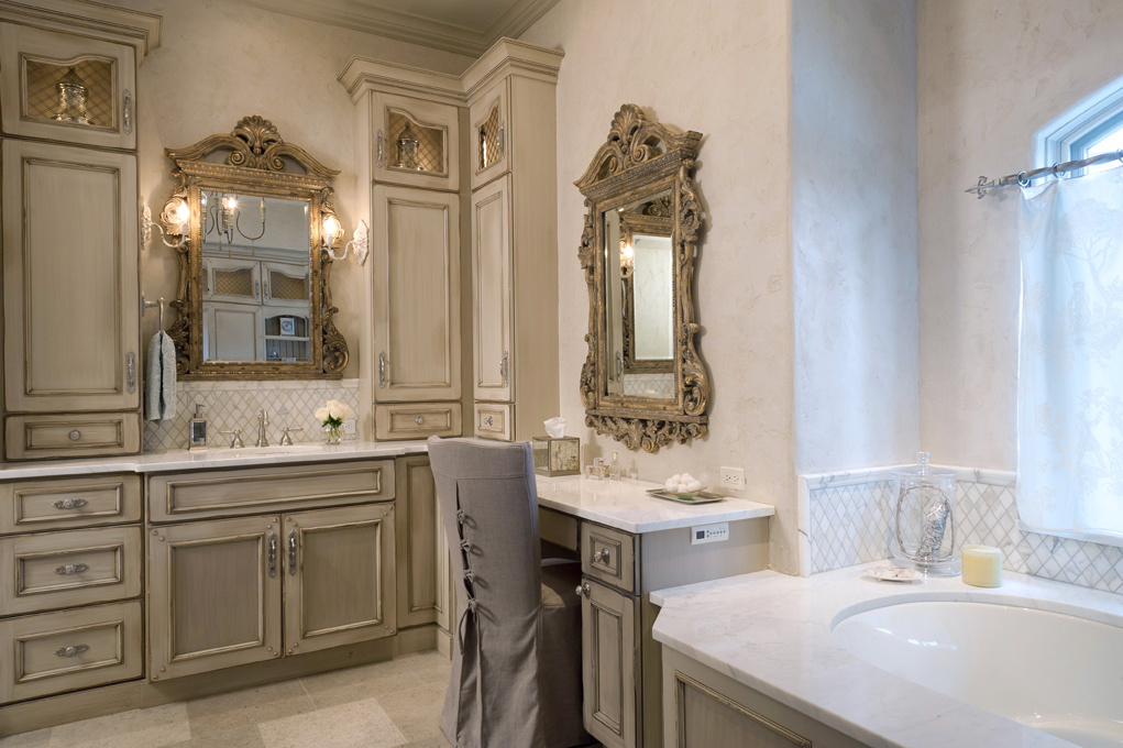 Marc Christian Fine Cabinetry was tasked with creating a spacious and luxurious bathroom with a feel of comfort and privacy in this 331-square-foot bath. The bathroom includes private his-and-her vanity/dressings areas each with its own whirlpool tub. A large, oversized walk-in shower is shared between the two tubs. The cabinetry was designed and handcrafted by Marc Christian Fine Cabinetry with an antiqued French décor in mind. The tile throughout the bath was hand selected and designed to fit the space. The tub decks and vanity tops are a creamy Calcutta gold marble and contrast nicely with the finish of the cabinetry. The mixture of Calcutta honed marble and 2x12 tumbled marble that make up the mosaic surrounding the tub adds elegant interest.
