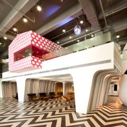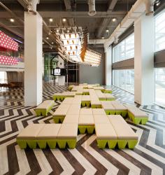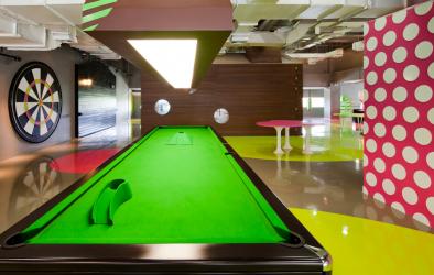 The new student lounge at Bangkok University is every young scholar’s dream space. Designed by architects Supermachine Studio, this updated student space is referred to by Supermachine Studio as “a youngsters’ ecology.” The multi-level lounge is located in the lower levels of the new complex at the university. Spanning two floors, students enjoy 3,000 square feet of study rooms and social areas, including a reading cave, a karaoke house, a music rehearsal room as well as a super-long pool table, giant dartboard and more.