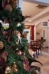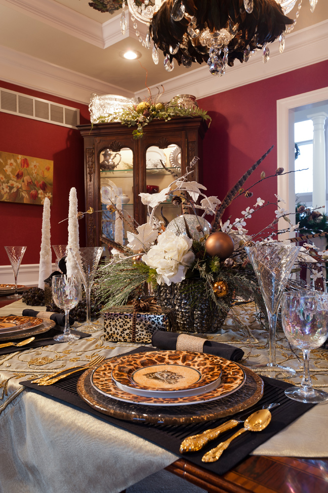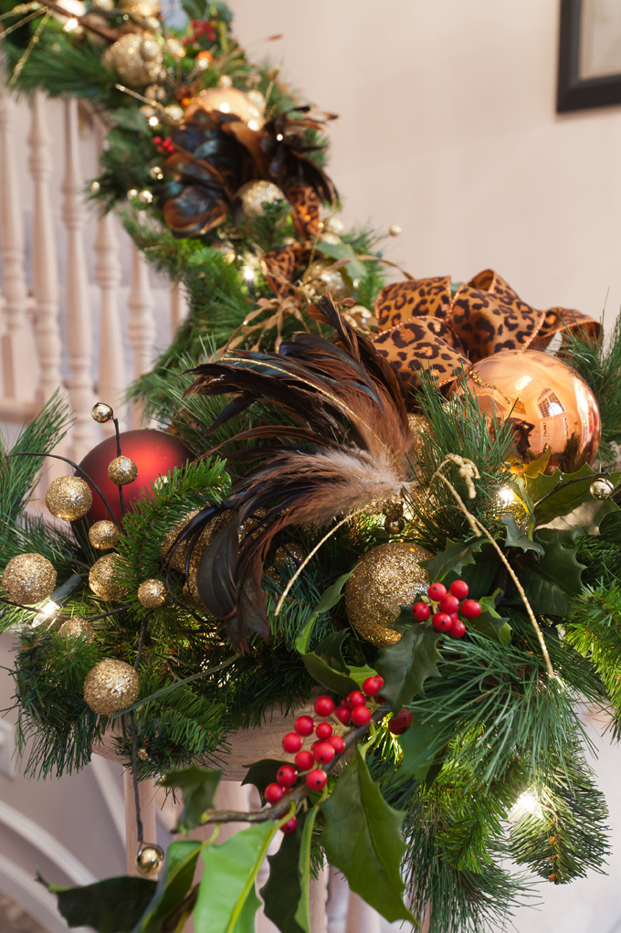 Clarice begins by choosing a theme, which helps to guide the process by suggesting colors and limiting which items in a collection to use. Last year, for example, she chose Africa as her theme, inspired by her love of and travels to the continent. Though unusual for the holidays, the concept allowed for the use of rich browns and warm tans that complement the season’s traditional reds, dark greens and glittery metallics, as well as the creative incorporation of sentimental items from both her holiday collection and her everyday life. Feathers and cheetah-print ribbon were tucked among the evergreen boughs of the foyer’s banister garland and the creamy white flowers in the dining room centerpiece, for example, while zebra ornaments hung alongside those with history on the great room’s Christmas tree.