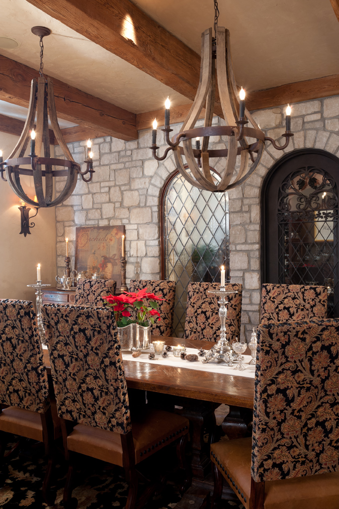 Suspended between the rustic wood beams overhead are stylized Restoration Hardware chandeliers, hand-crafted from French oak wine barrel staves and hoops, which draw attention to one of the most distinctive features of this home. The wine “cellar” is cleverly located on the main floor, adjacent to and accessible from the dining room. Two dramatic arches divide the dining room’s long, stone-faced wall; one encases the decorative entry door to this fully equipped, temperature-controlled storage area; the other is a muntin-style window offering guests a view of the owners’ extensive wine collection.