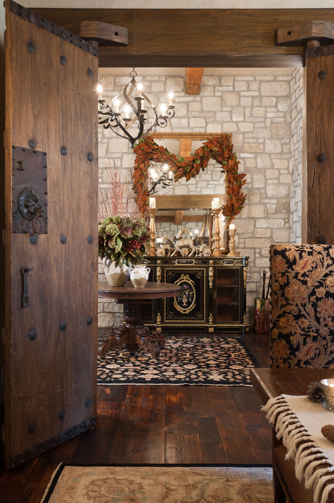 The home is ideal for large gatherings, prompting the owner to remark, “We can seat up to 50 guests for dinner.” And the formal dining room is a showstopper, starting with its imposing wood entry doors by Dave Dixon of Strange Imports in Colorado. Dixon purchases and restores antique furnishings from the Orient, as exemplified by these magnificent Asian courtyard doors, which harmonize beautifully with the reclaimed plank flooring that blankets much of the home’s main level. Making this architectural synergy even more unique, the flooring – installed with antique nails – was done by Sanford Headings, an Amish craftsman.