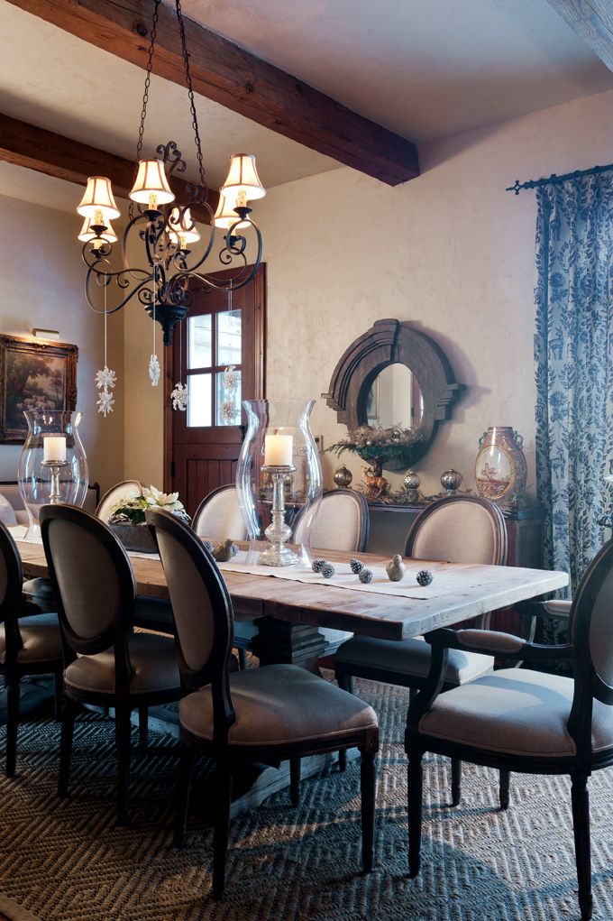 Acid-treated to achieve its aged, weathered look, the table can be extended from 7 to 10 feet in length and is surrounded by French oak chairs, upholstered in Belgian linen. Seasonal table ornaments include white poinsettias in a stone planter, glitter-frosted pinecone candles and two oversized hurricane candleholders.
