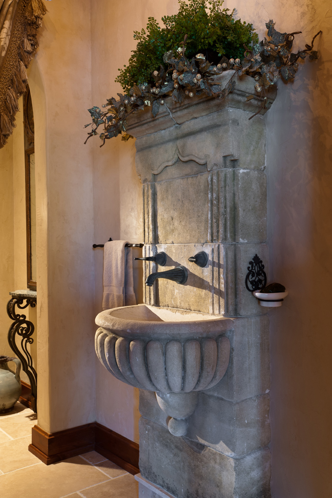 Powder rooms are an unlikely topic of social conversation but, in this case, guests probably can’t resist. The highlight of the powder room is a reproduction European fountain that has been retrofitted as a washbasin, and the privacy alcove features an ornate wrought-iron and marble console table topped by a French trumeau mirror. A faux grapevine with gold berries adds a holiday touch to the fountain.