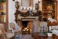 Flanked by arched cabinetry, the floor-to-ceiling fireplace is Aux Vases limestone from St. Genevieve. A rough-hewn beam serves as the mantel and provides the setting for fluted vases holding silvery sprays and pinecones, fresh soft greens and a faux boxwood garland interspersed with tiny lights.
