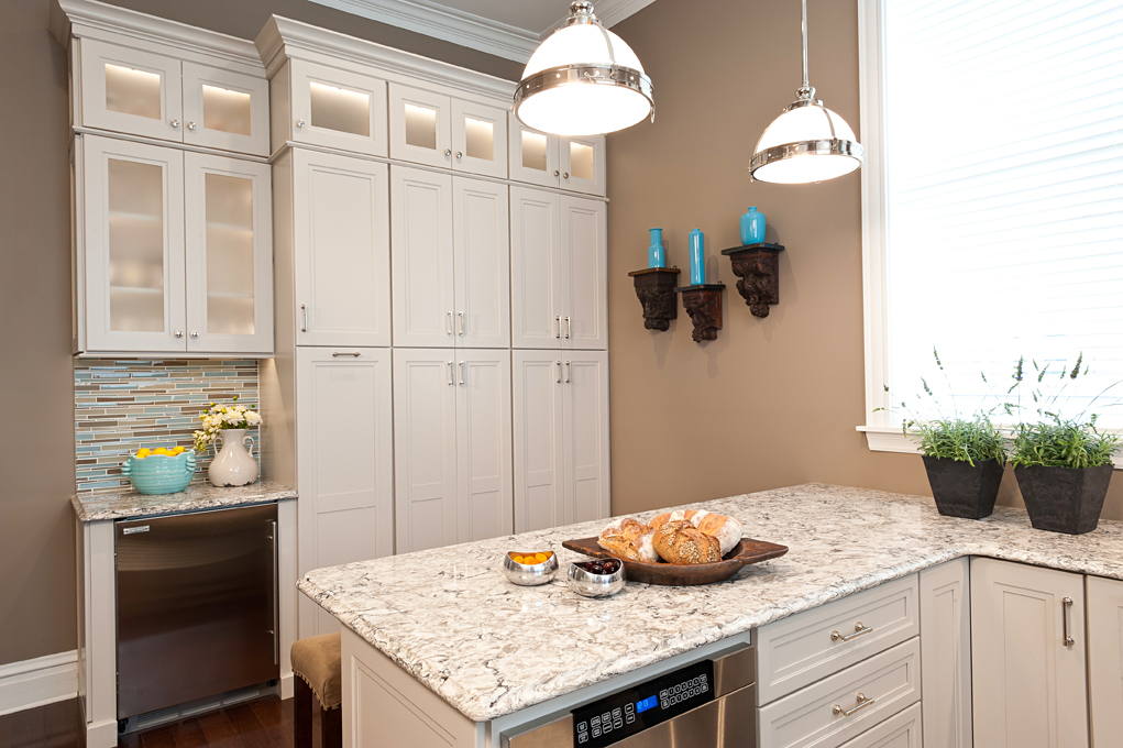 A beverage center with Sub Zero refrigerator and coffee bar is located outside of the main kitchen area to keep family members and guests out of the cook’s way. The homeowners’ children can now do homework at the island topped with Cambria countertops made from crushed quartz, which is located directly off the work area. To satisfy the cooks of the family, a Dacor dual fuel range with custom hood and Sub Zero refrigerator provide the latest technology while adding a modern touch.