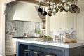 The Old World feel is accomplished with rustic ceiling beams and a custom antiqued silver pot rack installed above the island, which creates valuable storage. Texture was brought into the space with hand-brushed cabinet finishes, salvaged antique corbels and plaster. On the center island, the highly figured marble adds an element of visual texture. For contrast, black walnut hardwood flooring extends throughout the space.