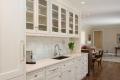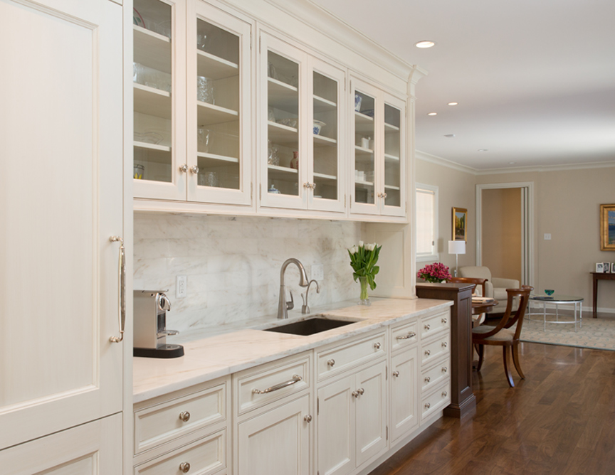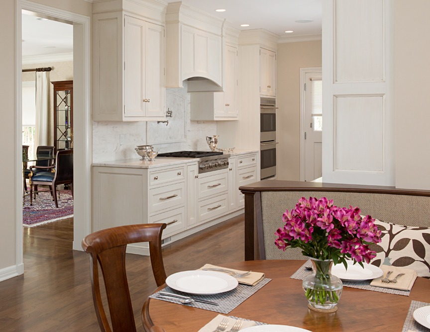 The classic galley kitchen of this 1960s ranch was lightened and brightened when Keith Gegg, of Gegg Design & Cabinetry, replaced the old blue-painted metal cabinets with white custom cabinets with beaded inset. The base cabinets have extra depth to create a flush look. With no windows in the space, the cabinetry around the sink was fitted with glass fronts for a more open appearance. Since the galley kitchen could not accommodate an island, a unique curved walnut banquette provides seating and serves as a transition between the kitchen and hearth room.