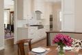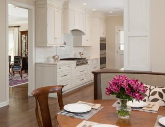 We really appreciate how open and refreshing this galley kitchen feels. The banquette provides a unique solution for additional seating. A beaded inset on the white cabinetry adds interest to the classic white kitchen.