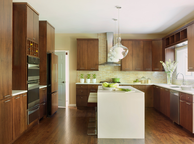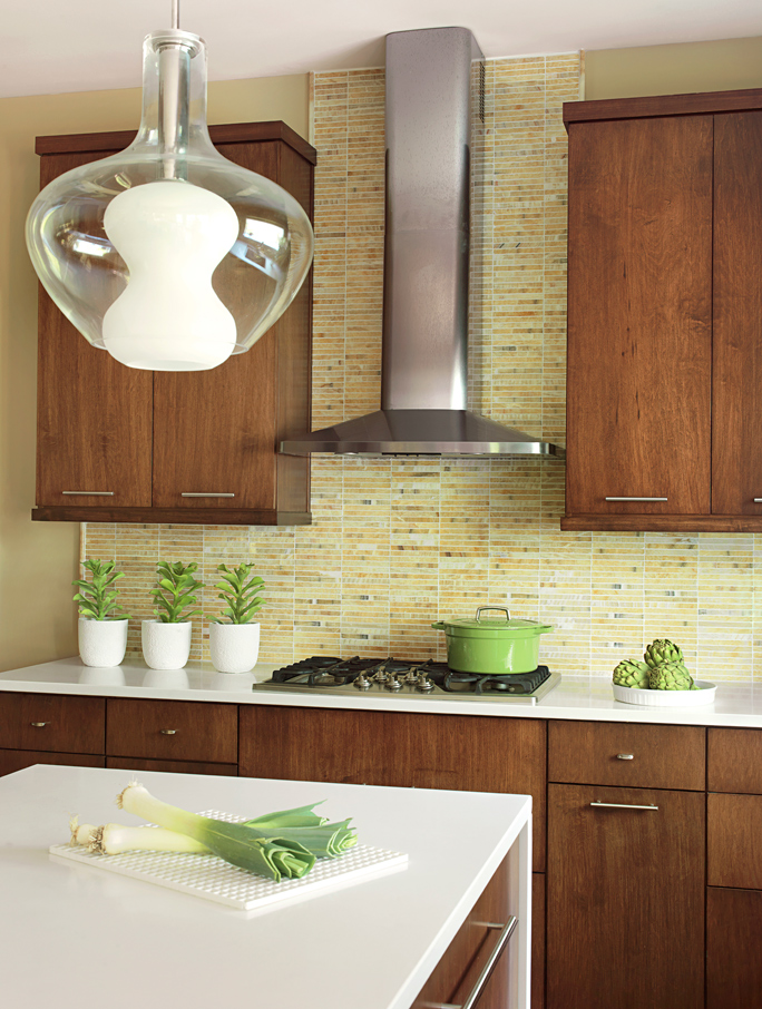 An outdated 240-square-foot kitchen is now a warm and inviting contemporary space with more useable storage and more functional workspace. Designer Melissa Rozell, of Directions in Design, Inc., paid special attention to space planning and budget when redesigning this kitchen. Because of space limitations and budget, the plumbing and cook top venting were kept in the same locations as to not add to construction costs. With a need for additional storage, Rozell changed the “U” shaped kitchen to an “L” shaped layout with an island that seats three. The island includes six long drawers for storage of pots and pans. The new design also incorporates a tall built-in pantry cabinet with pullout storage. The built-in Kenmore oven, convection microwave and warming drawers are flanked by two butler’s pantries with lit frosted glass, wall-hung cabinets and under-cabinet beverage refrigerator drawers.