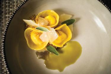 • Pumpkin-filled tortelli pasta in browned sage butter topped with shavings of Parmesan cheese and spiced walnut cookie crumbs.