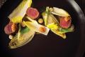 • Goat cheese mousse with Italian speck (smoked prosciutto) and toasted hazelnuts. “Those three things are really, really beautiful together,” Poremba says. Poached persimmons, dehydrated persimmon chips, crunchy meringues and a mustard-spiked cherry condiment called mostarda round out the plate.