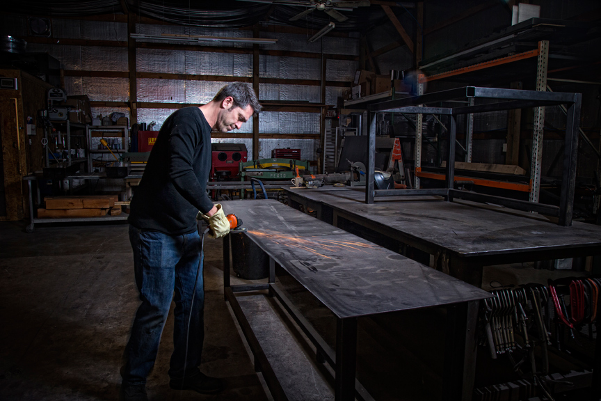 At the time, he was working in welding supply and has a degree in graphic design, so he learned the techniques by doing. He eventually left his job and opened a furniture shop downtown called Blend with his sister-in-law, who collected vintage farm furniture. The shop closed, and he opened his current business.