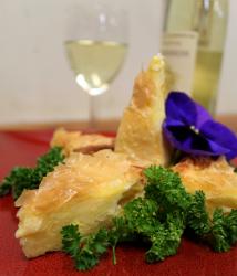 Directions: In a large bowl, whisk the eggs slightly. Fold the feta cheese into the whisked eggs. In a small saucepan, melt 1 stick of butter; set aside. Butter a 9 x 13 pan. Lay two sheets of phyllo dough in bottom of pan. Brush a few tablespoons of melted butter on phyllo dough. Layer 5 – 6 tablespoons of the egg/cheese mixture. Repeat layers of dough, butter and egg/cheese mixture until finished. Top with 2 – 3 sheets of phyllo dough and brush with remaining melted butter. Bake at 350° for 35-40 minutes or until golden brown and a toothpick comes out clean.
