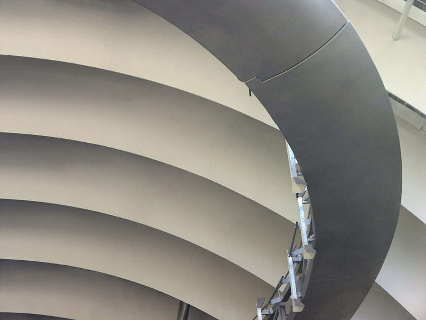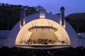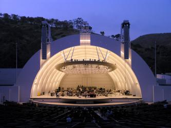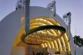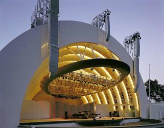 Set against the Hollywood Hills and built in the early 1920s, the Hollywood Bowl is known for its concave orchestra shell. In 2004, the amphitheater revealed a new shell as part of a six-year rebirth process. The Los Angeles-based architecture firm Hodgetts + Fung wanted to echo the memory and visual identity of the original shell in their new design. The new structure spans 124 feet and was fabricated off site. Hodgetts + Fung reinvented the acoustics and enhanced the functionality of the new shell. A new stage and back-of-the-house facilities also were included in the design.