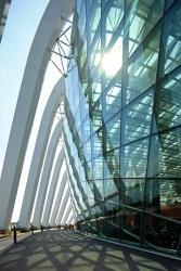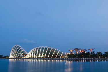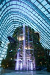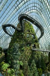 The centerpieces for Singapore’s new 133-acre Bay South Garden project are two climate-controlled conservatories, which are two of the largest in the world. Wilkinson Eyre Architects designed the glass and steel-cooled conservatories to bring the climates and plant life of the Mediterranean and Cloud Forest regions to tropical Singapore. The conservatories feature an indoor waterfall, a continuously flowering meadow, cascading levels of vertical plantings and high-level walkways through and above the tree canopy. Sustainability was the starting point of the design. A computer-controlled shading system and carbon neutral cooling technology were integrated to efficiently maintain the climate. Grant Associates master planned the overall scheme and surrounding landscape.