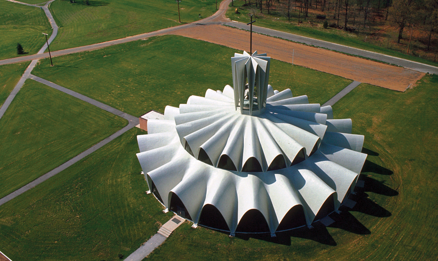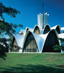 In 1962, notable architect Gyo Obata, cofounder of HOK architectural firm, which was established in St. Louis, completed the design of the Priory Chapel in Creve Coeur. Two sets of thin concrete parabolic shells on two levels set in 20 identical bays taper toward the center of the circular plan, giving the chapel a distinctive flower-shaped appearance. Three symmetrical tiers of whitewashed concrete are filled with Kalwall, a translucent fiberglass material, which appears black from the outside and has the transparency of alabaster on the inside. Obata limited the design to a few simple, but strong materials. Italian architect and engineer Pier Luigi Nervi consulted with Obata on the project, which celebrated its 50th anniversary in April 2012.