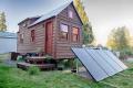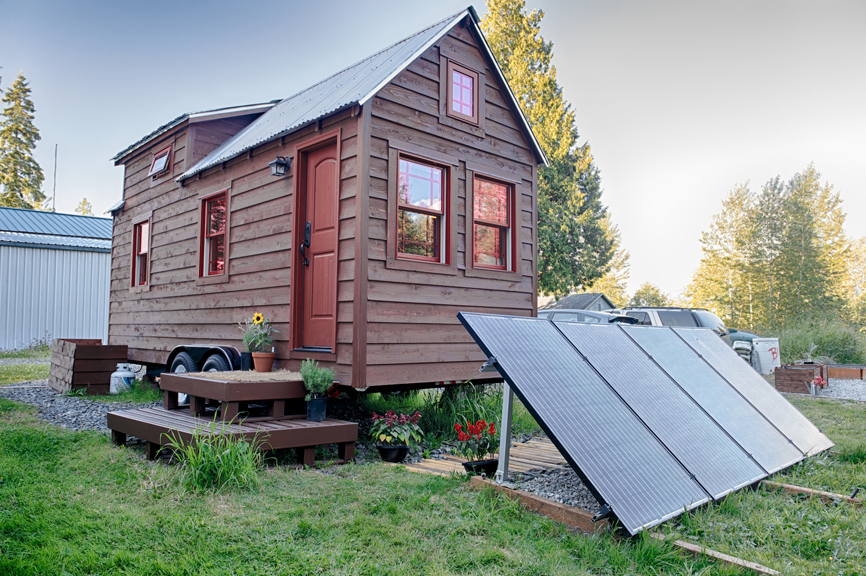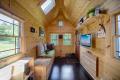 Tongue-and-groove pine wood was used on the interior sidings and walling. For insulation, sheep wool was placed between the double walling. The floor in the living room and kitchen is mounted with engineered bamboo flooring. Solar panels provide electricity. A sleeping loft on the second floor is cozy but not cramped because of the cathedral ceilings. Used as an office or quiet escape for the couple, the tiny home also doubles as a place for visiting guests.