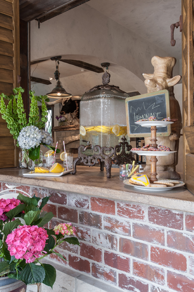 The pool house kitchen is equipped with a refrigerator, dishwashers and a farmhouse sink, salvaged from the same home as the kitchen cabinetry. The custom concrete counters are stamped with deer-hoof prints for a unique, added touch. A small, sliding door can be lifted and closed to create a serving area to the outdoor pool patio. In the summer, the serving door is an easy way for the homeowners and guests to grab cold lemonade or a frosty beer.