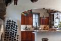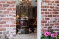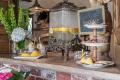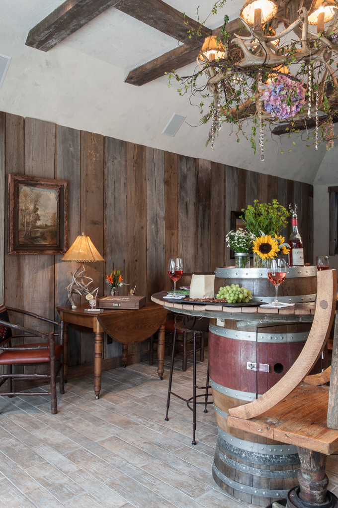 For additional seating, a beautiful, high-top table made of a vintage wine barrel from Napa Valley adds to the rustic, French charm. Two rustic, antler chandeliers light the main living area. The homeowner dressed each fixture by adding greenery, honeysuckle, hydrangea and hanging crystals for a whimsical, playful touch. French double doors open to the pool patio, making the room pleasant for year-round entertaining.
